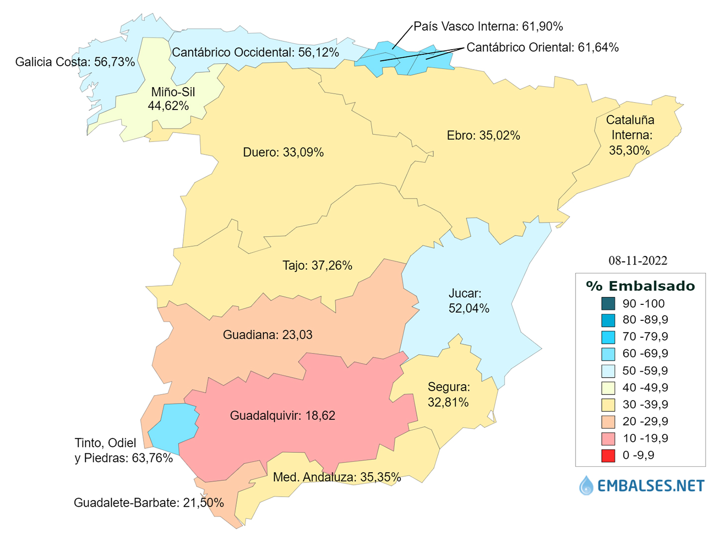 Uso embalses cuya situación por ámbitos, expresada en el tanto por ciento de agua embalsada en relación a su capacidad, es la que indicamos a continuación. Por encima del 50% están las cuencas del Tinto, Odiel y Piedras, al 63,8%; Cuencas internas del País Vasco, al 61,9%; Cantábrico Oriental, que se encuentra al 61,6%; Galicia Costa, al 56,7%; Cantábrico Occidental, al 56,1% y Júcar, al 52%. Entre el 50 y 30%, se encuentran la cuenca del Miño-Sil, al 44,6%; Tajo, al 37,3%; Cuenca Mediterránea Andaluza y Cuencas internas de Cataluña, ambas al 35,3%; Ebro, al 35%; Duero, al 33,1% y Segura, al 32,8%. Finalmente, las cuencas con menor porcentaje de agua embalsada, todas ellas por debajo del 30%, son las del Guadiana, al 23%; Guadalete-Barbate, al 21,5% y Guadalquivir, al 18,6%.