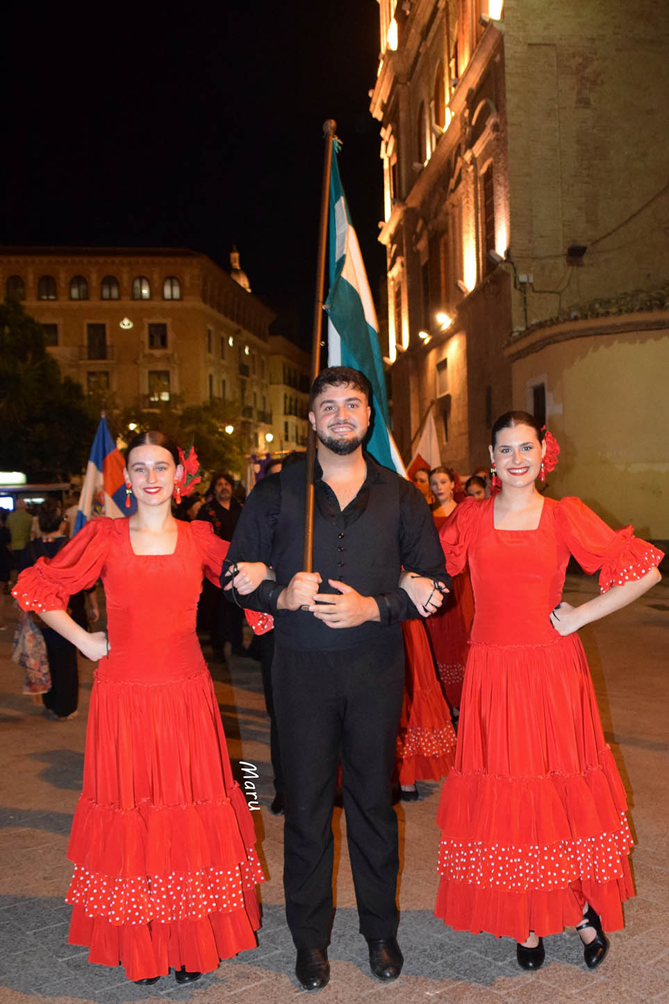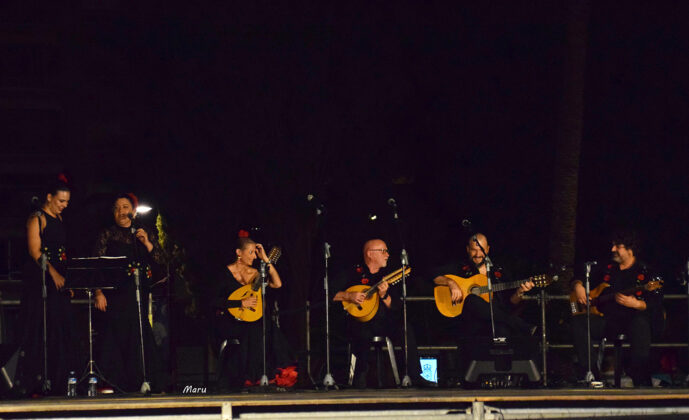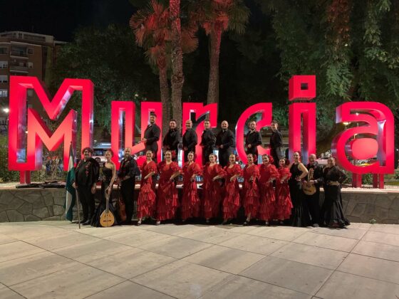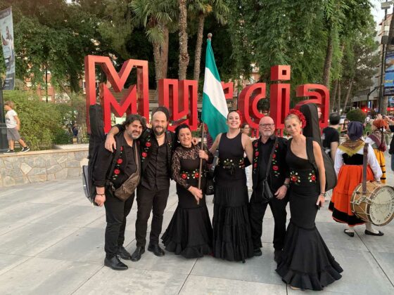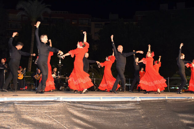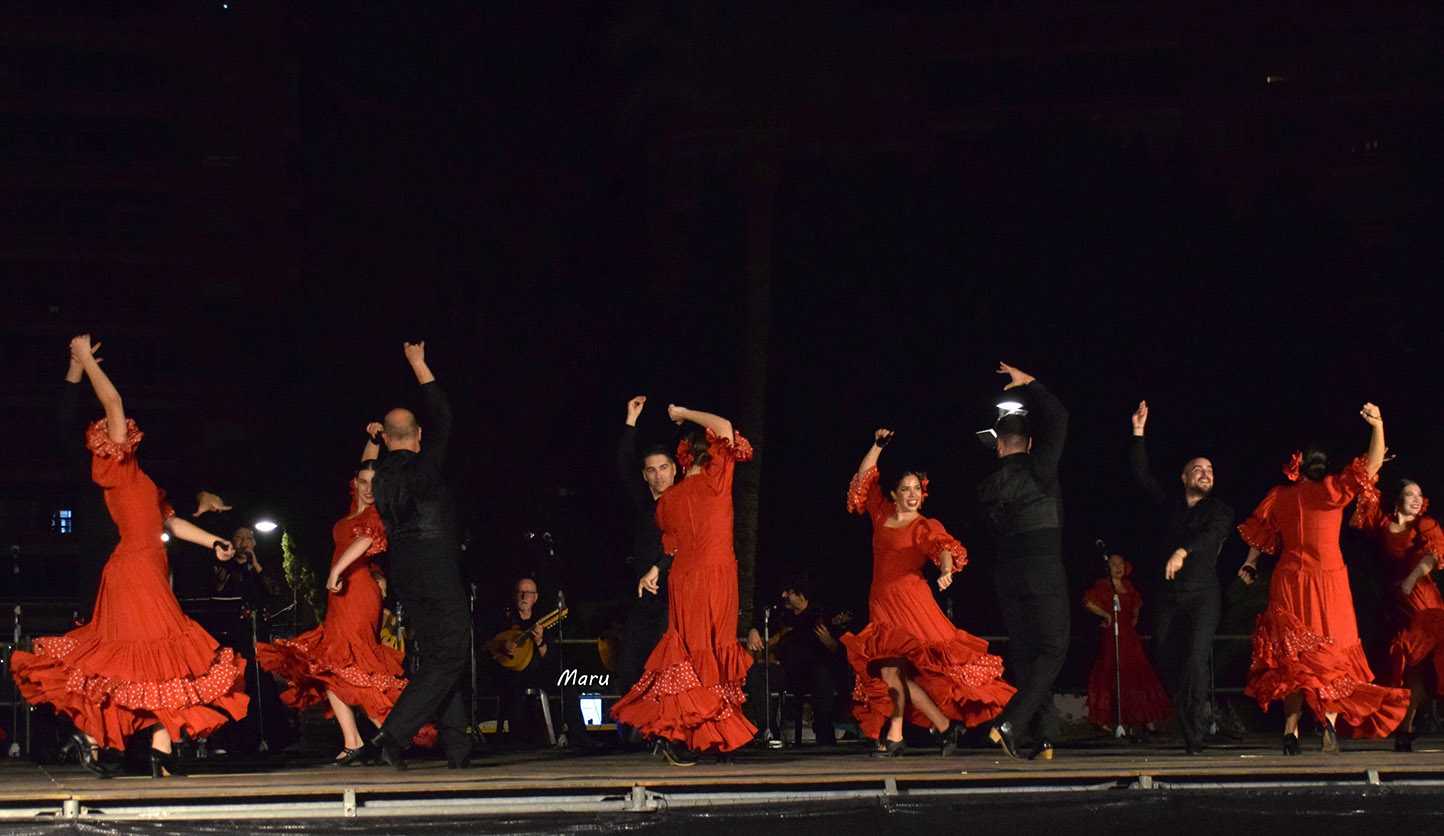 Después de un breve desfile por el paseo de Alfonso X, el grupo brilló de forma especial en la concurrida plaza, con un repertorio de los más flamenco, por petición expresa de la organización. Ofrecieron seis danzas que, con una delicada puesta en escena, contrastaron fuertemente el negro y el rojo de los bailaores y bailaoras del grupo.