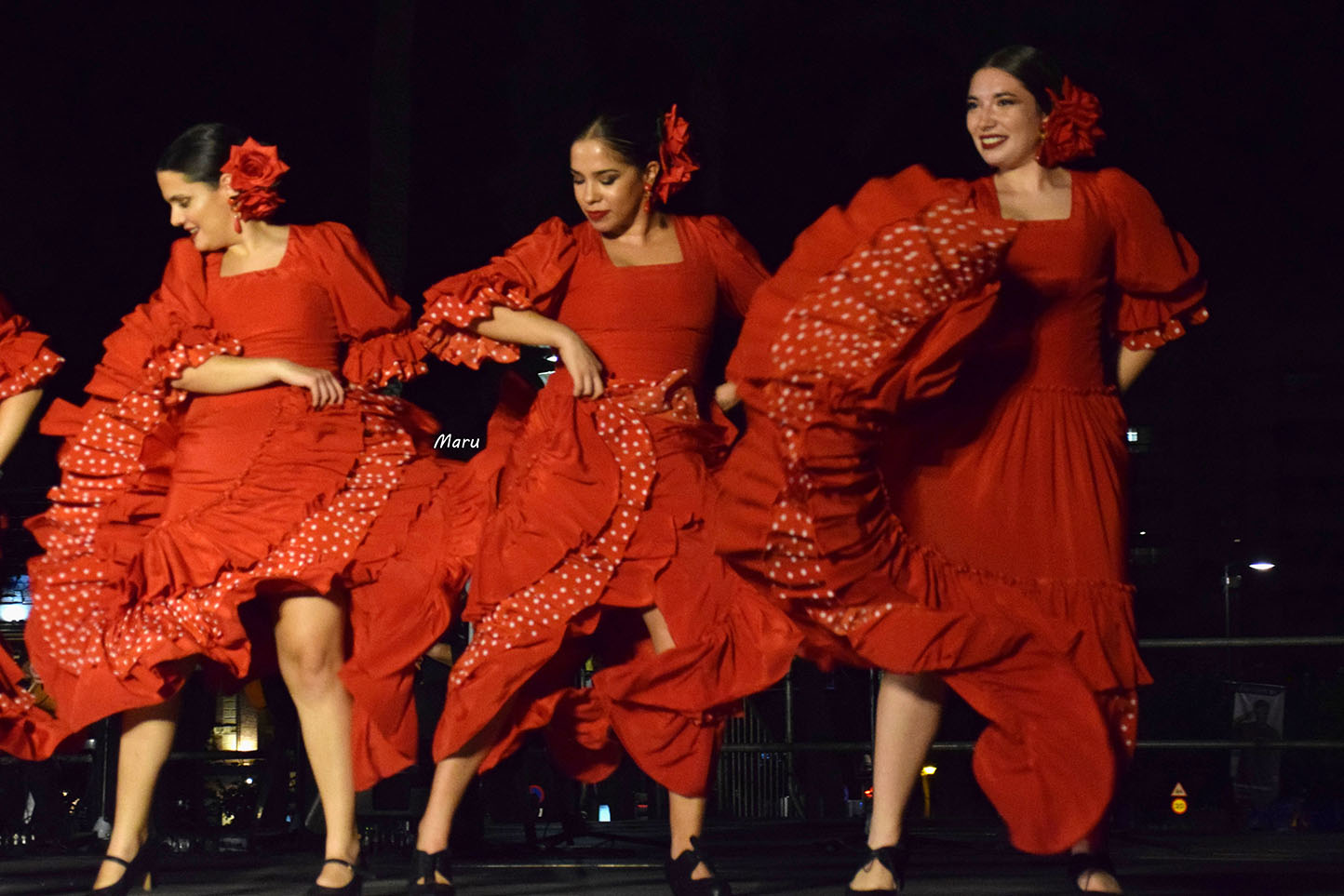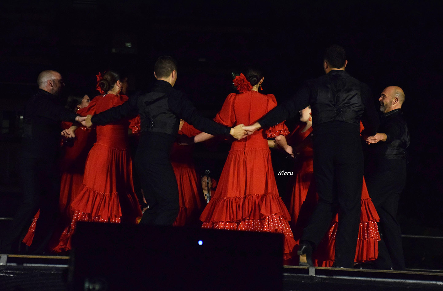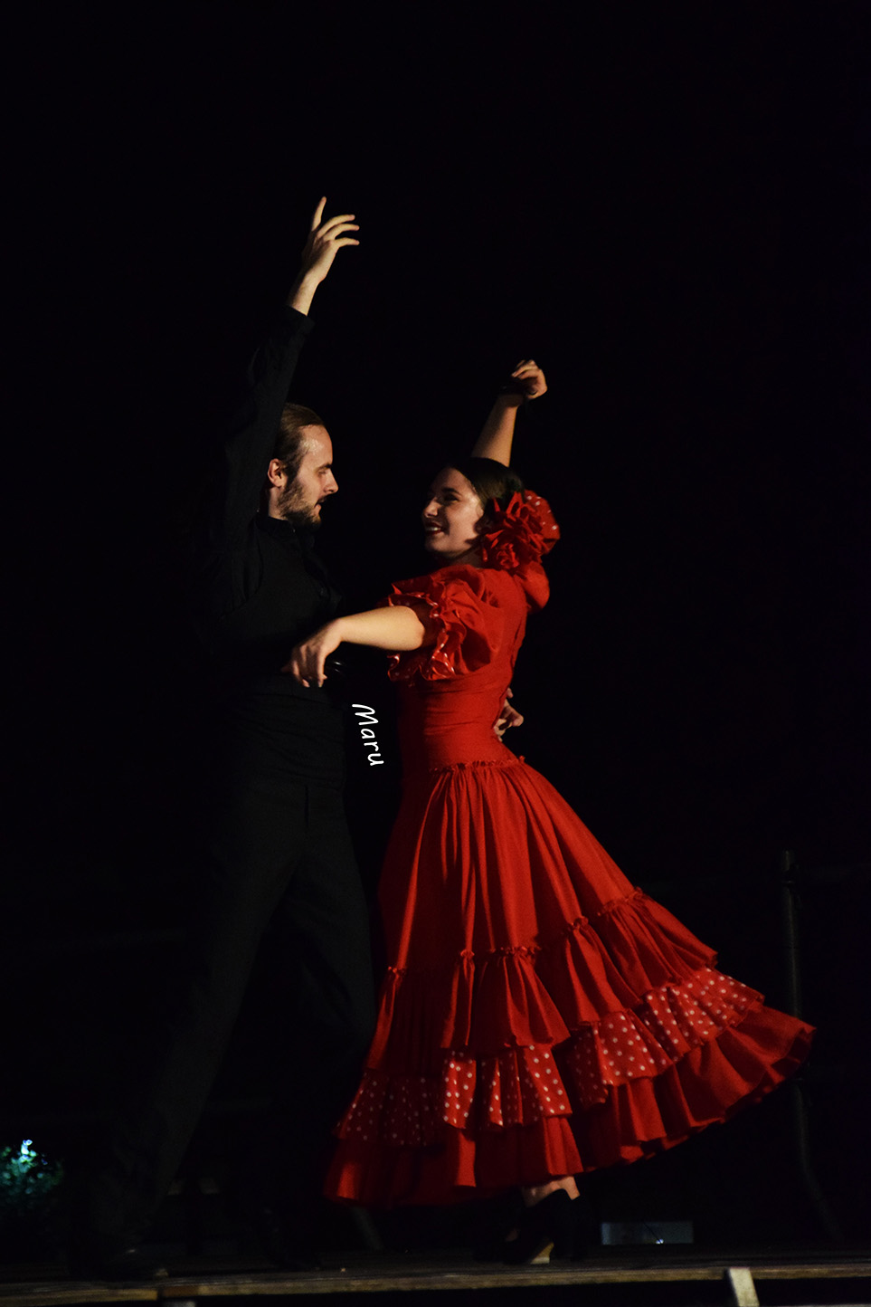 Después de un breve desfile por el paseo de Alfonso X, el grupo brilló de forma especial en la concurrida plaza, con un repertorio de los más flamenco, por petición expresa de la organización. Ofrecieron seis danzas que, con una delicada puesta en escena, contrastaron fuertemente el negro y el rojo de los bailaores y bailaoras del grupo.