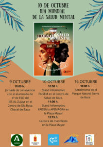 El jueves 10, comenzará la jornada con la instalación de un stand informativo de Faisem en el Centro de Salud de Baza, donde se dará visibilidad a esta situación. A partir de las 11:00h. la atención se traslada a la Plaza Mayor, donde Faisem y Afemagra instalarán una serie de stands informativos. Al mediodía, la concejala de Salud del Ayuntamiento de Baza, Mª Carmen Sánchez, dará lectura al manifiesto donde se expondrán las circunstancias y las reivindicaciones de las personas con problemas de salud mental.