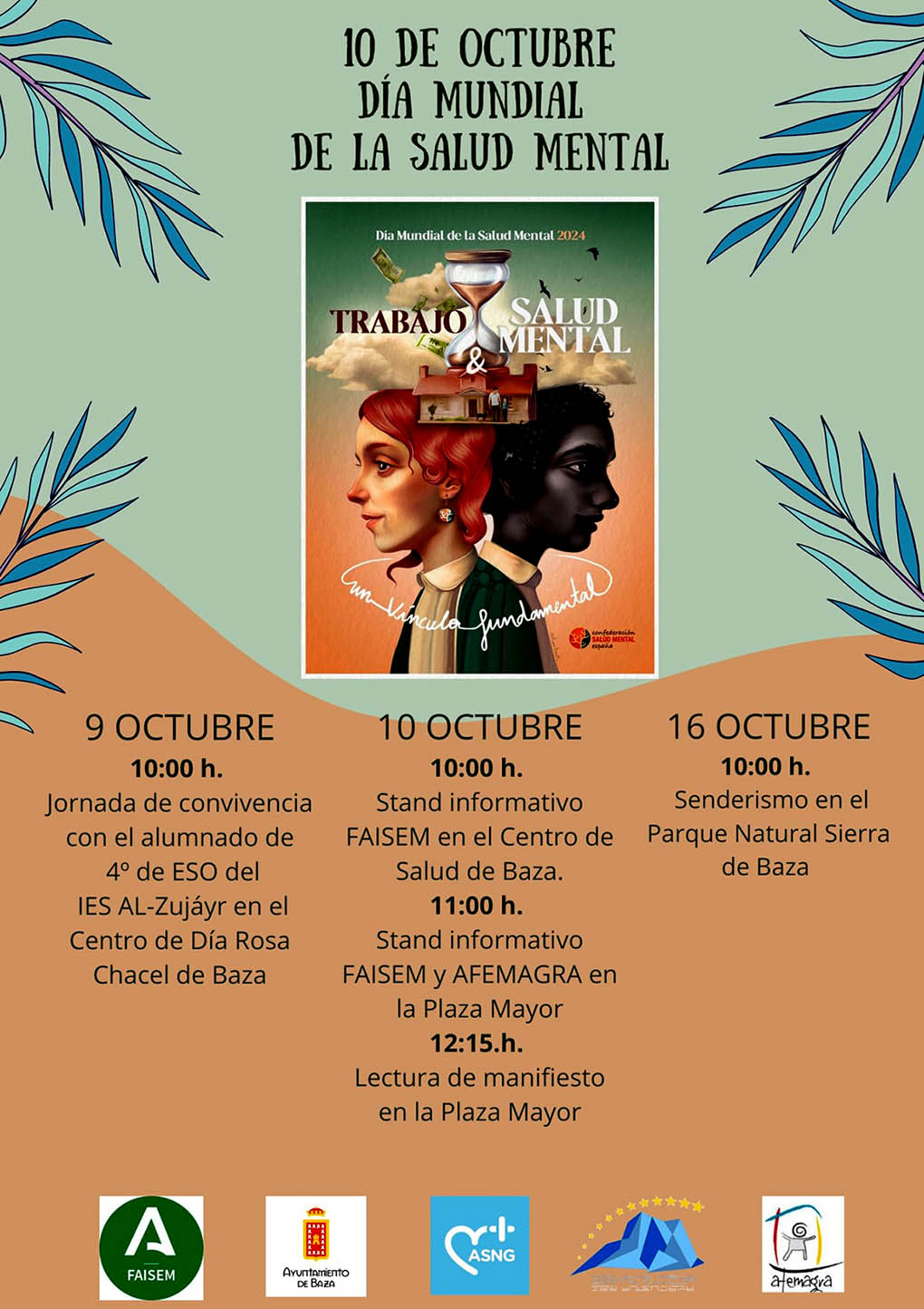 El Día Mundial de la Salud Mental se conmemorará en Baza con varias actividades durante los días 9, 10 y 16 de octubre. “Trabajo y salud mental, un vínculo fundamental” es el eslogan bajo el que se celebra este año el Día Mundial de la Salud Mental, que se celebra mañana jueves. Con tal motivo, el Ayuntamiento de Baza, en colaboración con otras entidades como el Área de Gestión Sanitaria Nordeste de Granada, el IES Al-Zujáyr, y las entidades Afemagra y Faisem, han preparado una programación especial para conmemorar esta emblemática fecha en nuestra ciudad.