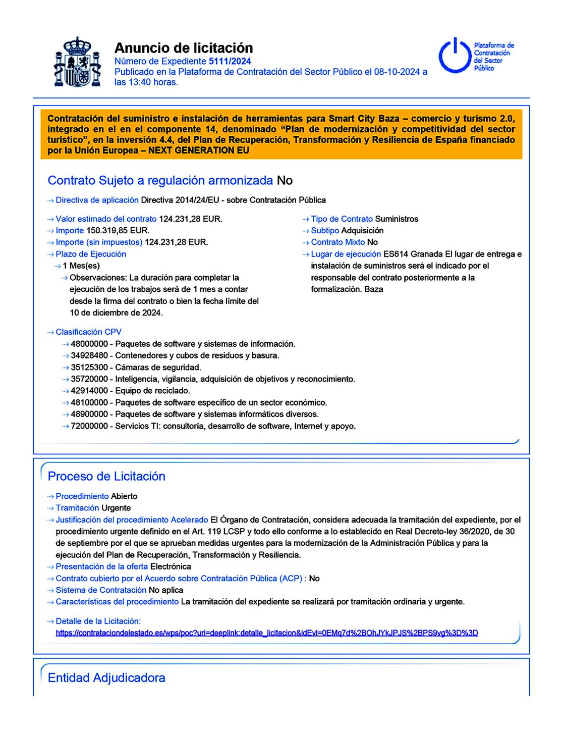 El Ayuntamiento de Baza saca a licitación el suministro e instalación de herramientas para la Smart City Baza. La Plataforma de Contratación del Sector Público ha publicado ya el anuncio de licitación que rige la contratación del suministro e instalación de herramientas para Smart City Baza – comercio y turismo 2.0, integrado en el componente 14, denominado “Plan de modernización y competitividad del sector turístico”, en la inversión 4.4, del Plan de Recuperación, Transformación y Resiliencia de España financiado por la Unión Europea – NEXT GENERATION EU.