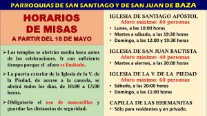 Reapertura para cultos de las Parroquias de San Juan y Santiago tras el cambio a la Fase 1. A partir del lunes 18 de mayo se inicia la Fase 1 de la Desescalada, lo que permitirá celebrar culto de manera pública en los templos y capillas, pero con unas medidas de seguridad que habrá que respetar al máximo, conforme al Decreto dictado por el Obispado.