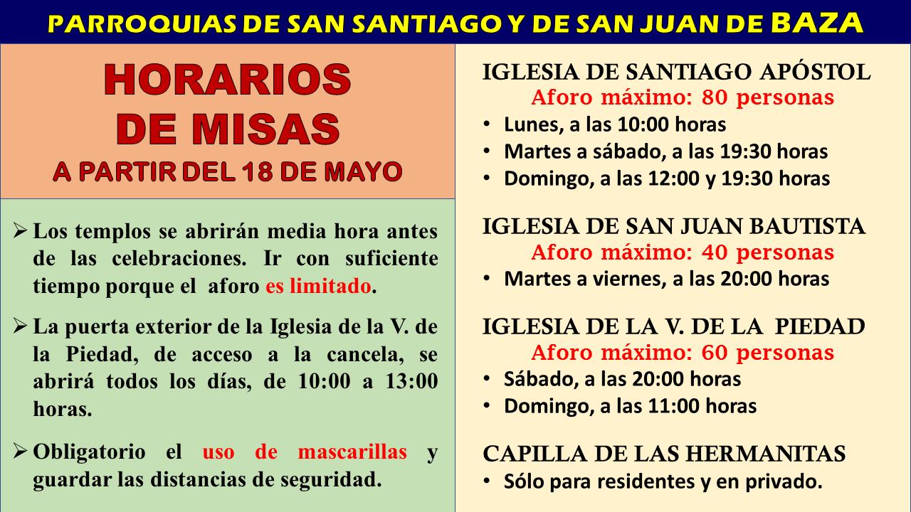 Las Iglesias de Santiago, San Juan y Ntra. Sra. de la Piedad se abrirán al culto público permitiendo la asistencia de fieles, mientras que en la Capilla de las Hermanitas se celebrará la Eucaristía diaria, pero solo para los residentes.