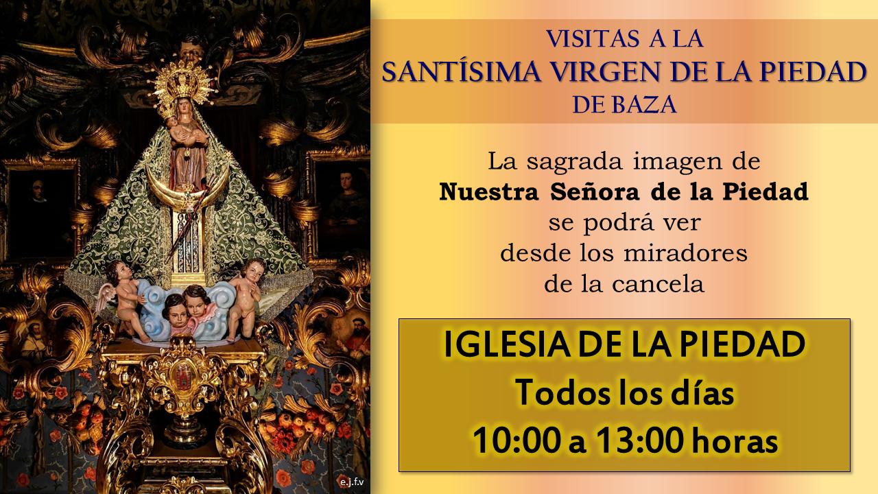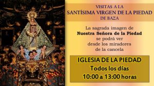 La Iglesia de Nuestra Señora de la Piedad abrirá sus puertas exteriores, todos los días, de 10:00 a 13:00 horas, con acceso a la cancela para ver desde allí a la sagrada imagen de la Virgen de la Piedad.