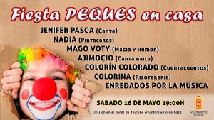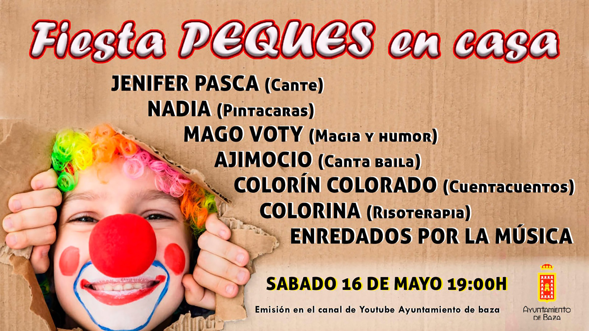 La tarde del sábado se emite un festival de actuaciones infantiles con media docena de artistas bastetanos. Pensando en los niños y niñas de Baza el Ayuntamiento de Baza ha coordinado la elaboración de “Fiesta Peques en Casa”, un festival de dos horas de actuaciones musicales y de bailes, pintacaras y cuenta cuentos en el que participan Jenifer Pasca, Nadia, Mago Voty, Ajimocio, Colorín Colorado, Colorina y Enredad@s por la música.