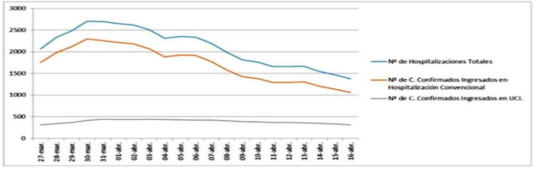 Actualmente, 1.372 pacientes confirmados con COVID-19 permanecen ingresados en los hospitales andaluces, de los que 315 se encuentran en UCI, lo que supone un importante descenso con respecto a días anteriores, tras alcanzar el pico máximo el pasado 30 de marzo.