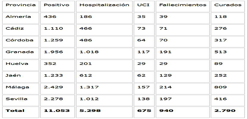 La Consejería Salud y Familias informa que se han confirmado en Andalucía 246 nuevos casos de Coronavirus en las últimas horas. La Consejería Salud y Familias informa que se han confirmado en Andalucía 246 nuevos casos de Coronavirus en las últimas horas, elevando el número total de afectados en nuestra comunidad, que asciende a 11.053.