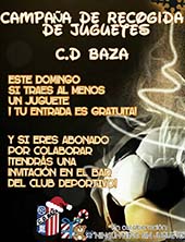 | El CD Baza se une a la campaña "Ningún niño sin juguete" y cambia la entrada del domingo por la entrega de algún regalo destinado a los niños. Desde el C.D Baza se ha tomado una decisión que entendemos muy encomiable, la cual consiste en que el club bastetano se unirá a la campaña "Ningún niño sin juguete", que está llevando a cabo el Ayuntamiento de Baza, junto a los voluntarios de Cáritas y Cruz Roja y la Asociación Jabalcón. | |||||||||||||||||||||||||||||||||||||||||||||||||||