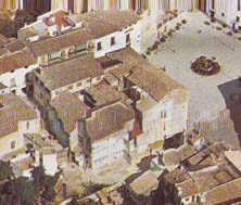Fotografía nº 1. Vista área de la alhóndiga en los años setenta. En ella podemos apreciar las cubiertas de teja y no las terrazas que se han “sacado de la manga” en el proyecto presentado.Solución alejada de la arquitectura local y nada adecuada a una alhóndiga. |