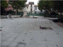 Por lo ejecutado por el consistorio bastetano podemos afirmar que se ha eliminado gran parte del empedrado de la plaza en contra de lo marcado por el P.G.O.U., en contra de lo marcado por la Ley. La imagen de la ficha del catálogo es muy clara, toda la plaza estaba empedrada. Tan sólo mencionaba (en prensa) hasta hace pocos días el ayuntamiento la reproducción del empedrado en las inmediaciones de la cruz y poco más. |