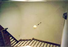 Se ubica dentro del ortógono del patio, en uno de los laterales del inmueble, continuando la tradición de la escalera claustral, en un lugar descentrado y secundario, siguiendo una dirección de tipo quebrado desde la entrada. Se encuentra junto a un patio lateral del que recibe la luz adecuada. La caja es amplia y cuadrada, con cuatro tiros ortogonales por planta y está cubierta por una cúpula de aristas. Se debería realizar catas por si existen pinturas murales que puedan ponerse en valor. |
