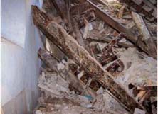 Como ya hemos comentado anteriormente la Junta evitó contestar con respecto a este convento. Por ello el Defensor del Pueblo Español nos comunicó que: “La ausencia de respuesta de este último requerimiento, expresiva de la falta de colaboración de la Administración para cumplir con el deber legal que le impone el artículo 18.1. de la Ley Orgánica 3/1981, de 6 de abril, del Defensor del Pueblo, provocará que, en su caso, se proceda a incluir a la mencionada Consejería en el informe de gestión que se eleva a las Cortes Generales, pudiendo, asimismo, dar lugar a la iniciación de las acciones que sobre las responsabilidades de las autoridades y funcionarios contemplan los preceptos contenidos en la citada Ley Orgánica (2-2-2011)”. Hace varios meses volvimos a reclamar ante Defensor del Pueblo Español y nos dijo que había solicitado al andaluz que reabriese de nuevo el expediente que había cerrado incomprensiblemente y a nuestro entender la firma de este convenio que estamos celebrando es una de las consecuencias... 2. Colocación de chapas en todo el conjunto monumental Volvemos a solicitar públicamente y por escrito una actuación urgente ante los hundimientos generalizados en el convento y en el templo. Los hundimientos están presentes en todas las partes del recinto monacal. Como botón de muestra vean las siguientes imágenes. La Ley sigue sin aplicarse en los magníficos salones renacentistas que están desapareciendo rápidamente. Las grandes vigas, magníficamente policromadas y conservadas hasta ahora, caen por doquier y el agua y el sol está haciendo desparecer casi en su totalidad su policromía desde 2006. La Ley obliga a intervenir al ayuntamiento si no lo hacen los dueños. Pasados ya cinco años desde la caída de las cubiertas cualquier justificación por parte oficial es absurda y más cuando han anunciado en octubre de 2008 y marzo de 2010 que las obras las hacía de oficio el ayuntamiento. |