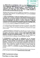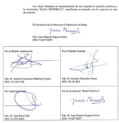 Reunida el día 18 de junio de 2014 la “Mesa por el Patrimonio”, compuesta por la asociación “Baza Histórica” y los partidos políticos PP, IU y PA, se acordaron los siguientes puntos: 1. Pedir al ayuntamiento, que en unión con la Junta, comience a elaborar con la máxima celeridad el Plan Especial de Rehabilitación y Recuperación del Conjunto Histórico de Baza, enfocado al programa del Área de Rehabilitación de Barrios y Centros Históricos y al resto de programas regionales, nacionales y europeos a los que nuestra ciudad se pueda acoger, cumpliendo con lo anunciado por el Parlamento Andaluz en el año 2000 y en el 2012, tal y como propone la Delegación de Educación y Cultura. |