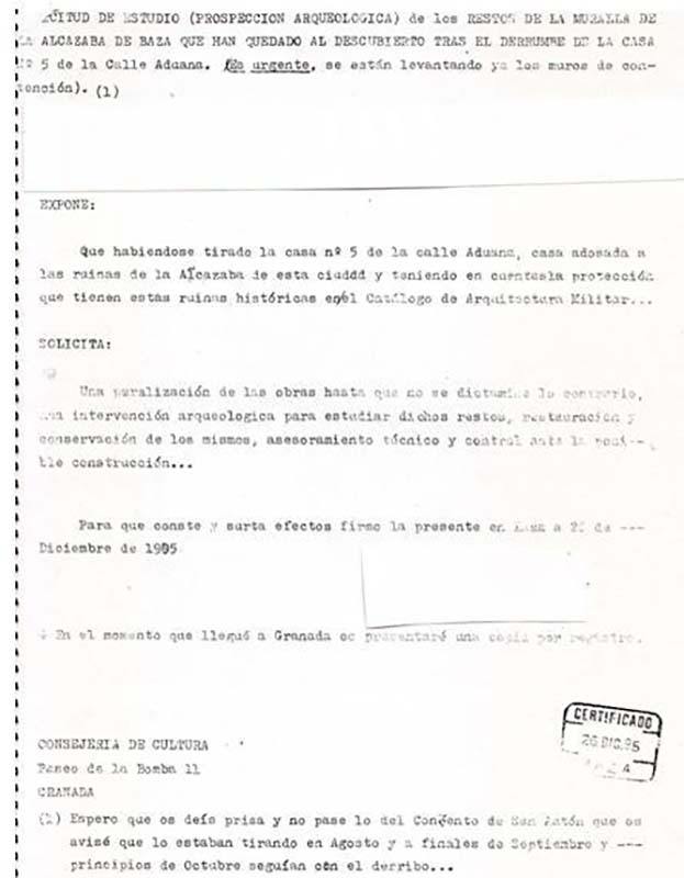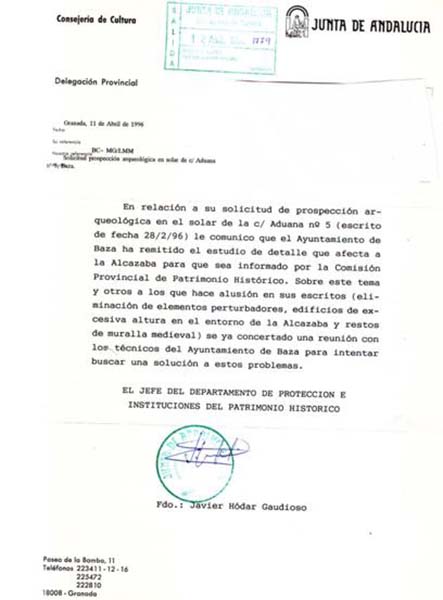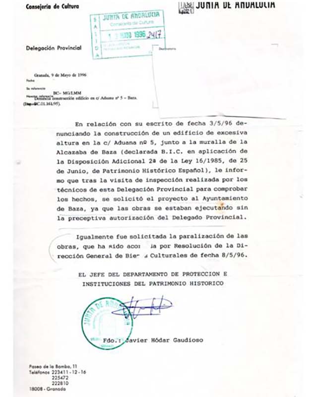 Como ya han denunciado varios ciudadanos en la prensa provincial a lo largo de las tres últimos década, las obras ilegales y la prevaricación han sido claras en nuestra Alcazaba y hay bastantes pruebas que pueden demostrarlo. Los bastetanos que solicitamos la aplicación de la Ley antes de levantar el edificio ilegal que hay junto a la torre (y las familias de los mismos, entre las que se encuentran miembros de la asociación “Baza Histórica” ) fuimos presionados una y otra vez, por decirlo con palabras suaves. Que conste que todo esto pudo evitarse pues se solicitó a Cultura que controlara la edificación a levantar en numerosas ocasiones antes de poner los cimientos del inmueble, la primera vez el 26-12-1995 (ver anexo nº 1), momento en el que la construcción actual era tan solo un solar. Al final el edificio se levantó y se paralizaron las obras, cuatro meses después, por estar ejecutándose sin la preceptiva autorización del Delegado Provincial y por Resolución de la Dirección General de Bienes Culturales con fecha del 8-5-96 (anexo nº 2). El ayuntamiento no solicitó la autorización preceptiva de la Delegación Provincial mientras los dueños levantaron el edificio pues el consistorio le había dado la licencia.