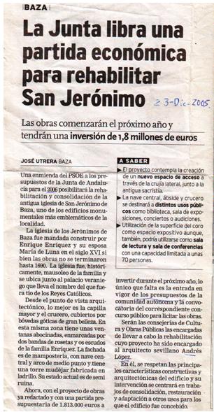 En marzo de este último año la Comisión Provincial de Patrimonio anunciaba a bombo y platillo que el ayuntamiento tenía vía libre para comenzar el proceso de adjudicación de obras. Jamás se adjudicaron y jamás vimos un euro. La única diferencia que podemos observar entre los anuncios de los últimos diecinueve años del PSOE y el de ahora (que se convertido en realidad) es que hay otros políticos dirigiendo la Consejería de Fomento. De la misma forma que alabamos la rehabilitación de la iglesia felicitamos a la “Mesa por el Patrimonio” por su persistente ayuda a conseguir que la rehabilitación se lleve a cabo, por el apoyo de todos los representantes de los partidos políticos que se están moviéndose por la recuperación del patrimonio bastetano, por los distintos concejales del PP, PA e IU que han formado parte de la Mesa a lo largo de los últimos años. Muchas gracias por vuestra colaboración, San Jerónimo se va a recuperar para nuestro pueblo. |
