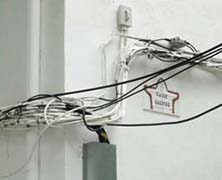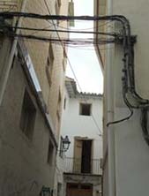 Barrio de San Juan No sólo el centro está inundado de cableado, barrios enteros como el de San Juan siguen las mismas pautas. Tanto en los callejones más alejados como en las plazas y vías cercanas a monumentos, caso de la plazas de San Juan o Cava Alta (entornos directos de Monumentos Nacionales y futuros BIC), proliferan frondosos cableados, muestras ornamentales poco adecuadas de un barrio en el que no se cuida nada su imagen. |