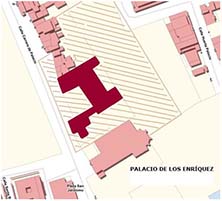 Plan de actuación. Palacio de los Enríquez y entorno inmediato (Zona rayada: huerto-jardín y jardines de la parte delantera, en Carrera de Palacio).