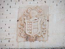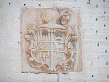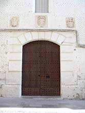 La portada almohadillada, uno de los pocos lujos permitido de la fachada, cuenta con jambas y arco escarzano de dovelas con juntas talladas, rehundidas, con el objeto de resaltarlas del resto del paramento. El arco, de siete dovelas, se adapta a los preceptos de Alberti. Éstas son de piedras escuadradas de gran tamaño, iguales entre sí, de forma que hay correspondencia, como en una balanza, entre las de la derecha y las de la izquierda en cuanto a forma, tamaño y peso… Posee una puerta tradicional de dos hojas verticales de madera, disponiendo en una de ellas, la de la derecha, de otra menor recortada en su interior por la que se efectuaba normalmente el paso de las personas, abriéndose completamente para el acceso de carros y animales. Está adornada con clavos con forma de flores distribuidos a lo largo de toda la superficie y alguazas en los ángulos. Como era habitual, sobre la portada, y para darle prestancia a la parte principal del edificio, se incorporan tres escudos heráldicos envueltos y adornados por elementos vegetales de formas ondulantes y rocallas. Las armas reales en el centro por tratarse en origen de un edificio de fundación regia, las del corregidor a la izquierda, representante de la corona en el municipio y las del alcalde a la izquierda, máxima dignidad del concejo, bajo cuyo mandato se erige el inmueble. |