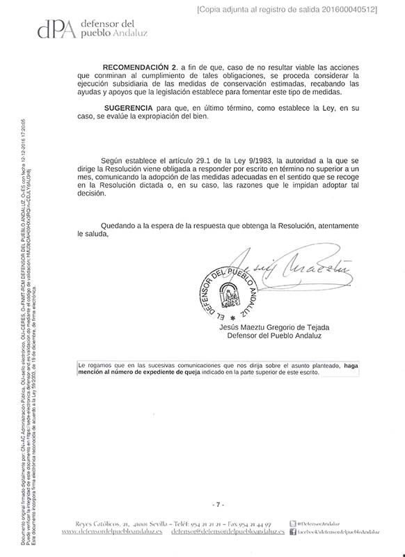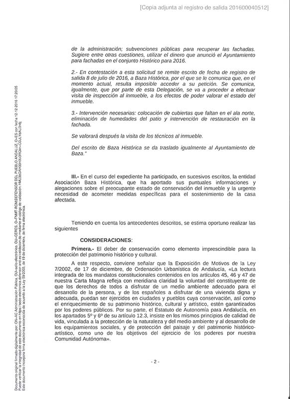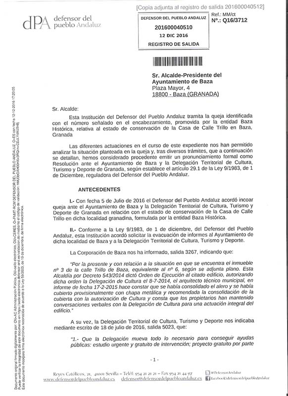 3. El Defensor del Pueblo Andaluz en los últimos diez años Llevamos más de una década reclamando, la recuperación de éste y otros edificios, ante el Defensor. Hasta el momento no ha servido para nada. Si esta institución actuase conforme a la Ley, y denunciando públicamente, la situación cambiaría… Hace cuatro meses una ciudadana exponía en prensa que el Defensor “les baila el agua” al PSOE pues no denuncia lo que está sucediendo a pesar de tener varios expedientes abiertos. La realidad es mucho más dura y los hechos lo demuestran. Juzguen ustedes. Los bastetanos nos evitaríamos tener que enviarle escritos al Defensor (año tras año) si éste denunciara (como hizo su antecesor) lo que está pasando. ¿Creen que encontraran información sobre la ruina de este monumento local y el incumplimiento de la Ley en la Memoria de 2017? Hasta hoy en día no se ha reflejado nada sobre lo que está pasando y el incumplimiento de la Ley por parte del Ayuntamiento, y de la Junta, ningún año en dicha Memoria. El consistorio, viendo que tienen carta libre, sigue sin aplicar la Ley del Patrimonio, ejecutar las obras de emergencia. Por todo lo expuesto podemos afirmar que en Baza, en Andalucía, el PSOE no cumple la Ley del Patrimonio. Lo que está pasando es indignante. 4. Propuestas de la asociación “Baza Histórica” Nuestra asociación ha solicitado (en numerosas ocasiones a lo largo de las dos últimas décadas), tanto al Ayuntamiento como a Cultura y al Defensor: