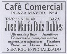 | Ya en los primeros años del siglo XX, tenía fama la tienda de ultramarinos, que José Maria Ruiz Robles, tenía en el número cuatro de la Plaza Mayor. Su venta no sólo era de ultramarinos finos, eso sí, siempre las mejores marcas… ( en conservas “Miau, Bernal o Hero, en embutidos los de Vich, el lomo embuchado de “Los Quijales, y los quesos de Marsenet y Grau, quesos M.G. como se les conocía). Nada mejor si querías tener una buena mesa en Navidad, ya que al mismo tiempo podías adquirir las botellas de anís, licores, sidra o champagne, o las mejores marcas de turrones etc. Pero su mayor fama le vino al establecimiento por el esmeradísimo servicio de café; todavía hay quien recuerda el “especial”, recién tostado, del día, y el “corriente”, que llevaba la mezcla de malta. |