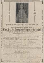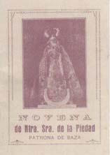 Sólo se pedía lo necesario, pues si durante los días de estancia de la Virgen en la Iglesia Mayor, llovía, se acababa la petición. Si durante estos días no llovía, entonces se iniciaban las rogativas, y tras estas las de ad postulandan serenitatem. Como observamos, este proceso cultural, ligado a la fe en la Virgen de la Piedad como mediadora de las súplicas o peticiones de los labradores, ha ido evolucionando, pero no así los fenómenos atmosféricos que aún persisten. Tanto las Novenas, a Ntra. Sra. La Virgen de la Piedad, como las Rogativas, tienen una antigüedad contrastada, pues ya en el año de 1738, Fray Juan Barroso, Comendador del Convento de la Merced de Baza, mandó imprimir la NOVENA A NUESTRA SEÑORA LA VIRGEN DE LA PIEDAD, dedicando este librito al señor don Isidro Corvera Cisneros y Sarabia, Alguacil Mayor del Santo Tribunal de la Inquisición. |
