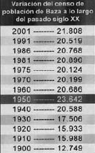 Ellos, nuestros emigrantes, en la lejanía más diversa, han tratado de agruparse en asociaciones: "La Casa de Baza en Cataluña" o "La Casa de Baza en Madrid" (hoy desaparecida). Y han sido absorbidos por las “Ferias andaluzas” que se celebran en distintas poblaciones del Levante, Cataluña, Madrid y otras localidades, pero ya incluidos bajo el genérico de “andaluces”. Hemos tardado cincuenta y ocho años en volver a recuperar casi la misma población que en el año 1950. Y digo casi, porque aún faltan 355 personas para tener el mismo censo de habitantes. Baza tiene un censo de 23.642 habitantes en el año 1950, a 31 de diciembre del 2008, tiene censadas 23.287 personas. |