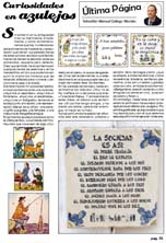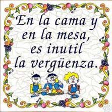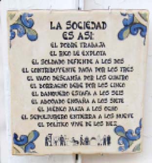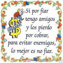 Siempre ha sido mi curiosidad leerlos; si los encontramos ante una vivienda: «Aquí vive un carpintero», «Aquí vive un fontanero», «Aquí vive un electricista», «Aquí vive un fotógrafo», teniendo el azulejo junto a lo escrito una representación clásica de su oficio: una sierra, un grifo que gotea, una lámpara, o una máquina de fotografías antigua. Encontramos azulejos preciosos como el «Reloj de Sol», o «La historia del Vino. Hay otros que nos avisan de algo «Cuidado con el perro», lo que es de agradecer. O nos dan la bienvenida, a un establecimiento en el que se puede leer «Lo mejor de nuestra casa, los clientes». En las paredes de tiendas y bares encontramos los clásicos: «Hoy no se fía, mañana sí» o del pobre que dice: «Yo también fiaba». Y compendiando estas ideas, el clásico que sentencia: «Si por fiar tengo amigos, y los pierdo por cobrar, para evitar enemigos, lo mejor es no fiar». |