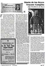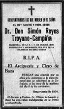 El Ayuntamiento bastetano, el dos de enero de 1948, en sesión extraordinaria presidida por su alcalde, Manuel Navarro Ros, acuerda «Nombrar Hijo Predilecto de esta ciudad a don Simón de los Reyes Troyano Campiña, Canónigo Magistral de la S.I. Colegial de Guadix, «por su amor a Baza». El 3 de junio de 1954, a la temprana edad de 53 años y tras una larga enfermedad, fallecería en Guadix este preclaro hijo de Baza. |