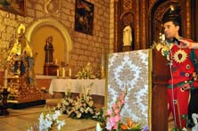 | El templo, en día de novena, abarrotado de fieles, es mudo testigo de su comparecencia ante la Virgen de la Piedad. Después, recibe la medalla de la Hermandad de Baza que le impone su presidente y se dirige a cuantos le escuchan para volver a dar fe de su devoción a la Virgen de la Piedad. |