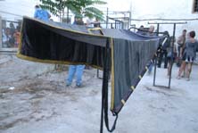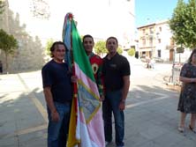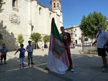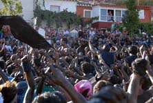 | En un abrir y cerrar de ojos, la gente se arremolina y se agacha a los pies de un Antonio Vera al que se le ve con ganas y del que hasta se diría que no sabe lo que le espera, mientras él alza la bandera hasta el cielo y la hace ondear por encima de las cabezas que le jalean y lanzan los ¡¡oooooeeeeeeeeee....!! que indican que pasa sobre sus cabezas, dejándose oír el zumbido que produce. |