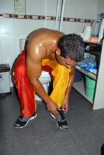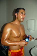 Después, Antonio Vera entra en su papel definitivo y marcha al cuarto donde se ha de untar de vaselina que le proteja de lo que le venga después, mientras muestra orgullosos un físico que es garantía de su disposición y hasta se permite responder a entrevistas en momentos en los que ya viste el pantalón que pronto dejará de ser multicolor. No hay nervios y sí serenidad. Mucha serenidad. y es que, con esta, son ya cuatro las veces que ha pasado el mismo trance. |