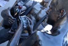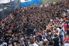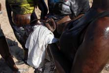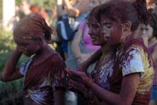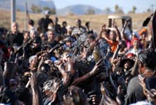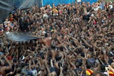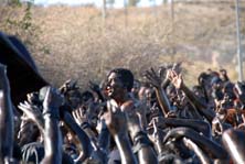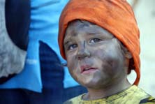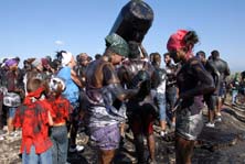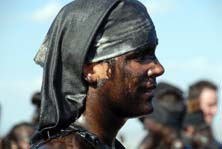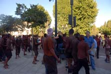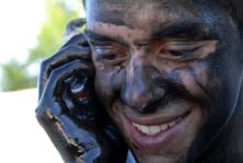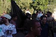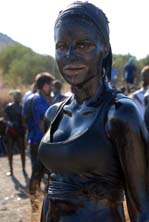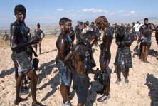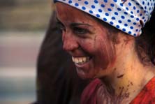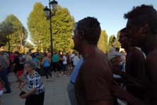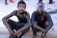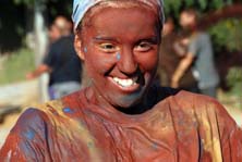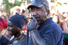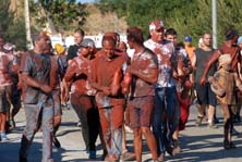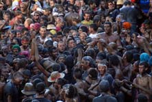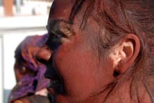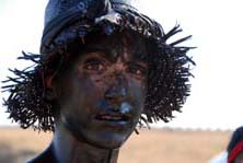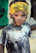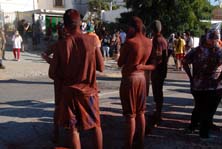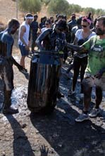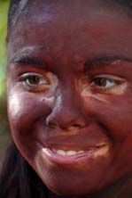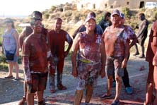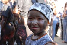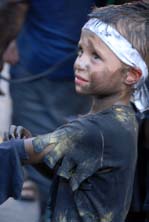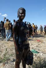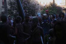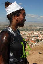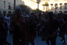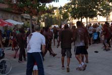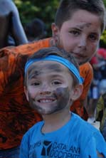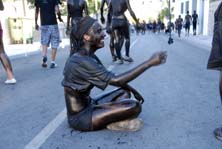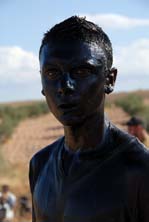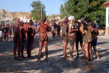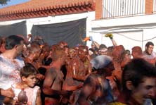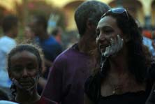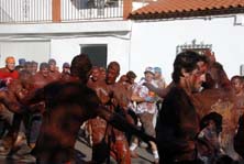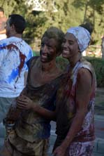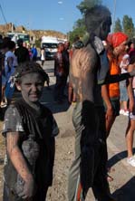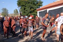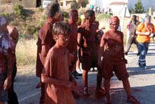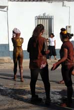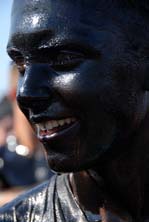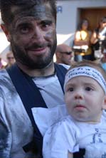 | Así, los depósitos que aprovisionan de pintura se van quedando vacíos y empiezan a verse docenas..., centenares..., miles de personas que ya lucen su negrura de pies a cabeza y que acaban conformando las más bellas imágenes de lo que podríamos denominar las caras de la fiesta y con la sana alegría de que, por encima de paridades, los hombres y mujeres de Baza se unen en participación y en disfrute de una Fiesta que sabe dar cabida, en el sitio que se elija, a cuantos en ella quieren estar. |