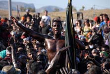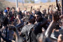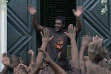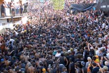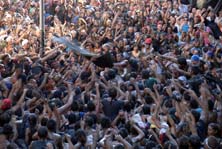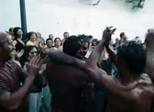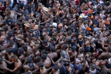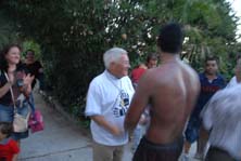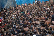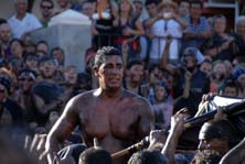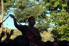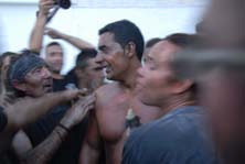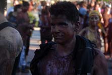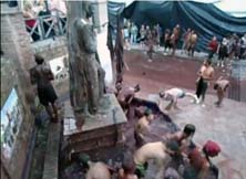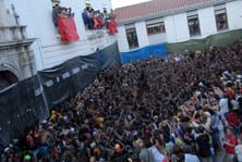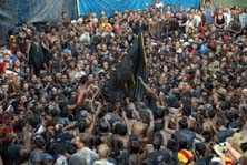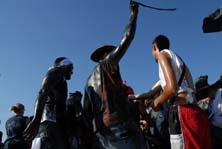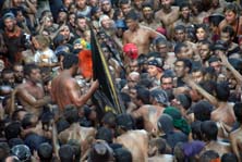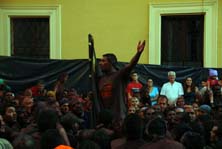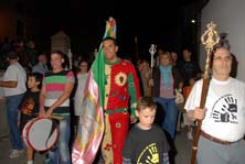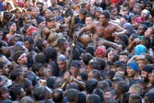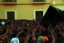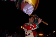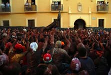 | A veces la multitud carga con él sobre sus hombros, a veces le permiten correr y mezclarse entre el tumulto de gentes que le acompaña, luciendo en ocasiones la cachiporra que aún dará a probar a algunos de los que se le acerquen. |