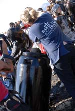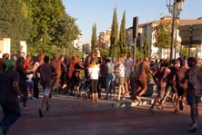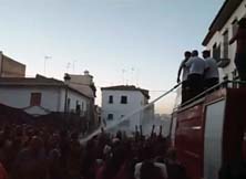 | Y acabada la jura, el camino se empieza a acortar cuando son los bomberos accitanos los que acuden a refrescar a los corredores, muchos de los cuales optan por bañarse en la fuente que recuerda el homenaje al singular y querido Cascamorras. |