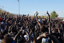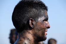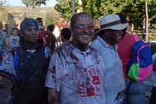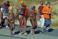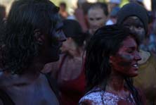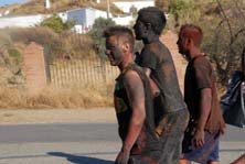 | Mientras tanto, en Las Arrodeas se vive el ritual mágico de la preparación de los corredores que esperan a Cascamorras, confirmando la transformación del anterior "pintar· por el actual "pintarse"cuidando, eso sí, que al menos los cristales de las gafas queden despejados, que, después, el camino es largo y no es cuestión de verlo todo más negro de lo que en realidad es. |