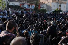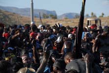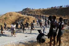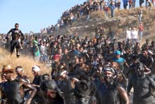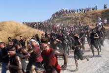 | Siguen después unos momentos de pausa en los que Cascamorras llega a la altura de la gran multitud que le espera y que no quieren dejarlo pasar sin volver a pintarlo. Mientras, las primeras avanzadillas inician su carrera en la que los más jóvenes parecen ser los que van en cabeza de ese serpenteante apretujamiento que viene detrás y en el que tambor y bandera son los signos más identificativos para localizar al de la cachiporra. |