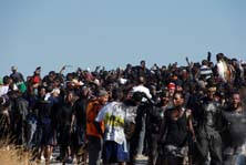 | Estalla el clamor, se suceden los vivas, se renuevan los cánticos y las primeras avanzadillas reanudan su carrera que les ha de llevar hasta el antiguo y ya casi olvidado paso a nivel, a partir del cual se produce otra de las novedades de este año, consistente en encauzar, mediante vallas, el flujo de corredores que se dirigen hacia los Caños Dorados y salvaguardar así el nuevo paisaje que ofrecen la Alameda y la Plaza de las Eras, donde este año se ha pasado de largo por el nuevo monumento al Cascamorras, ahora renovado y ubicado un centenar de metros fuera del itinerario por el que va la comitiva. |