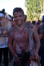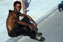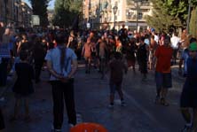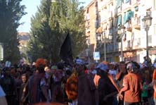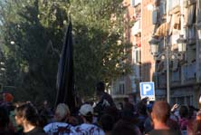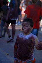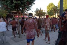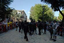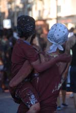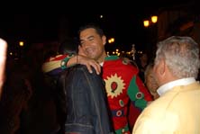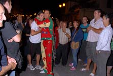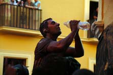 | Un Cascamorras que ahora se mueve entre la gente y corretea por las aceras, provocando la estampida general de los que van "limpios" y se ven sorprendidos por las salidas del presunto recorrido marcado, para el disfrute de cuantos por allí se encuentran y para que la fiesta sea aún más Fiesta. |