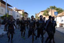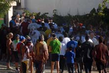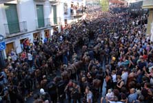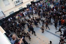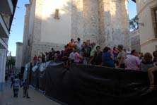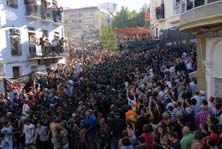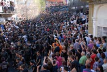 | Y se empieza con sólo el apretujamiento que permite el estrecho camino y que hace separa de la gran multitud, algo que permite a Cascamorras echar alguna carrera, cachiporra en ristre, algo que después será más dificultoso cuando se vea en medio de la gran "marea negra" que le acompañará en el resto del recorrido. |
