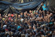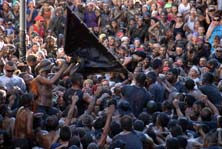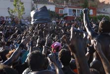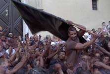 | Y entre toda la negritud, que llena el más mínimo espacio que imaginarse pueda, se alza la bandera bajo la que se agachan los más cercanos al Cascamorras y se jalea el ondear por el aire, que esta vez ya no se oye, pero que acaba como siempre, con los vivas de rigor, a los que suce |