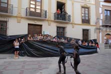 | Toca, pues, proteger el mobiliario urbano, vallar las fuentes del recorrido, tapar las fachadas... porque una "marea negra" realizará mañana el recorrido en el que acompañarán, y pintarán, al Cascamorras, desde el paraje de Las Arrodeas hasta la Iglesia de la Merced |