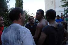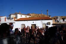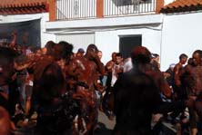 | Tras la puerta del convento, el patio es el escenario para el reencuentro de Cascamorras con los suyos, con su esposa, con su familia, con sus amigos... con su gente. Con ellos se comparte la alegría por la tarea realizada sin que, curiosamente, nadie hable de fracaso y todos viven con júbilo esos instantes. |
