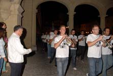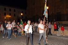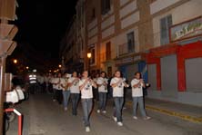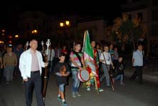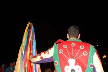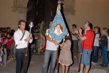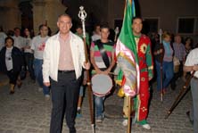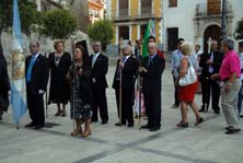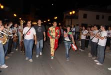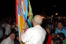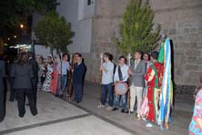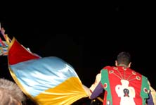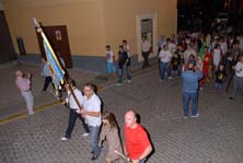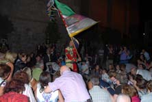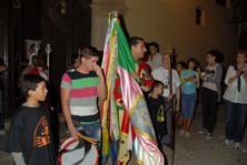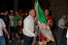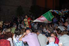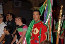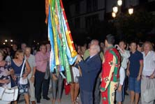 | Apenas terminado el acto oficial, en el que los abanderados entregan los pendones a los respectivos alcaldes de ambas localidades, el Hermano Mayor de la Hermandad de Guadix vuelve a tomar la bandera para prepararla y permitir que Cascamorras realice la que seré su última jura de bandera en Baza. El júbilo y el vocerío impregnan el aire de la noche bastetana, mientras grandes y pequeños vuelven a oír pasar sobre sus cabezas la imagen de la patrona, en la enseña multicolor que hace ondear Cascamorras en la espléndida noche bastetana. |