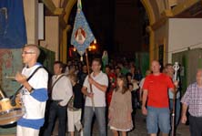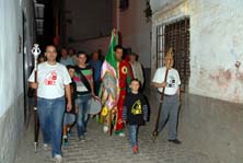 | Suenan los primeros cohetes y se forma la comitiva, encabezada por el banderín accitano de la Virgen, con las gentes de la Hermandad y el Cascamorras ataviado con traje de gala, al que acompañan su fiel tamborero, que siempre va a su lado, y la enseña de la Virgen con sus cintas multicolor |
