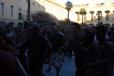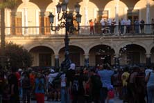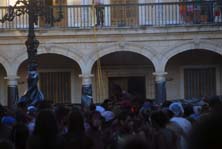 | En el patio del convento de la Merced también esperan ya la llegada del Cascamorras. Son pocos los que aguardan, pero muy próximos al accitano. Fuera, la plaza empieza a llenarse para observar como llega corriendo Cascamorras que esta vez, y cosa rara, más que precedido, va seguido por la multitud. |