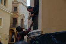 | Y en el mismo Palacio se abre siempre una ventana por la que aparece el Obispo y hasta quien aúpan al Cascamorras que, esta vez, recibe emocionado un regalo que besa con sus manchados labios y con lo más limpio de su corazón. "Es un rosario que me entregó con sus propias manos el Papa", fueron las palabras que acompañaron el sobre blanco en el que se hallaba. |