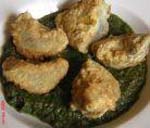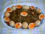 Se parte y se cuece bien la verdura con sal (acelgas, espinacas o espárragos). Se escurre y se aparta. En una sartén se fríen dos o tres dientes de ajo, unas almendras, una rebanada de pan y un pimiento seco y en ese mismo aceite se fríen las verduras, se cubren de agua, se le añade una hoja de laurel y se dejan hervir un poco. Mientras, se muele lo anteriormente frito con unos cominos y un poco de vinagre y se le añade a las verduras en el momento de apartarlas, procurando que quede espeso0. En el momento de servir, se puede adornar la fuente con huevos cocidos duros. |