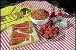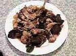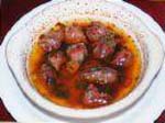 Se parte la carne (ternera o cordero) en trozos que no sean demasiado pequeños y se ponen en la olla Express con aceite, sal, un tomate rojo pelado y entero, una cebolla grande entera, un pimiento seco grande, un vasito de vino y otro de agua y se cuece durante unos quince minutos. Cuando está cocida se bate en la batidora el tomate, la cebolla y el pimiento, se añade otra vez al guiso y se deja reducir con la olla destapada hasta que quede en la salsa. |