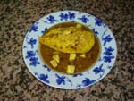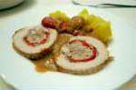 Se prepara un kilo de carne (cerdo o ternera) cortado especialmente para rellenar (se puede traer ya preparado de la carnicería), se salpimienta, se extiende sobre un mármol y se cubre con unas tortillas francesas redondas y finas, muchos ajillos picados, perejil picado, unas tiras de jamón serrano tocinoso, unas tiritas de pechuga de pavo o pollo y unas tiras de pimientos morrones. Se lía la carne y se ata fuerte con un hilo de algodón, se fríe en una sartén grande y se pone a cocer en una perola con aceite de freírlo, un tomate rojo pelado y entero, una cebolla entera, un pimiento seco, un vaso de vino blanco, sal y agua y se deja cocer unas dos horas , con cuidado de ir dándole la vuelta para que se cueza por parejo. Cuando está cocido se pone en una fuente y se deja enfriar antes de partirlo. La salsa se bate y se sirve aparte. |